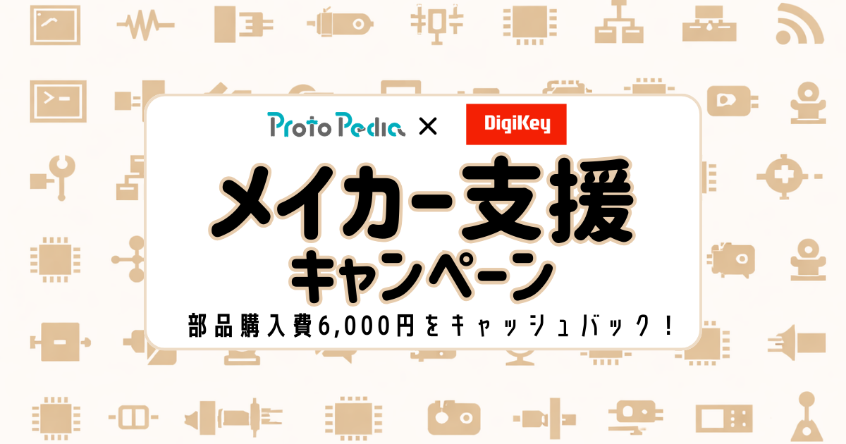 「メイカー支援キャンペーン」は、ITモノづくりに関する作品を記録・公開できるWEBサービス「ProtoPedia」が、DigiKeyご協賛のもと開催する電子工作コンテスト「DigiKey Make ONE Challenge 2026~自分イチのモノづくりに挑戦~」への応募作品の製作をサポートするキャンペーンです。